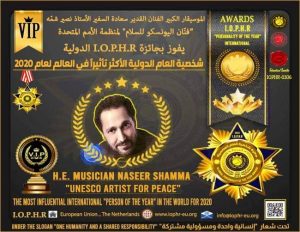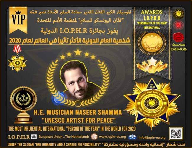 فنان اليونسكو للسلام سعادة السفير الأممي الموسيقار الكبير الأستاذ ( نصير شمّة ) الموقر جائزة “شخصية العام” الدولية الأكثر تأثيراً في العالم لسنة 2020، تقديراً لجهوده الثقافية والفنية والإنسانية المتفانية.