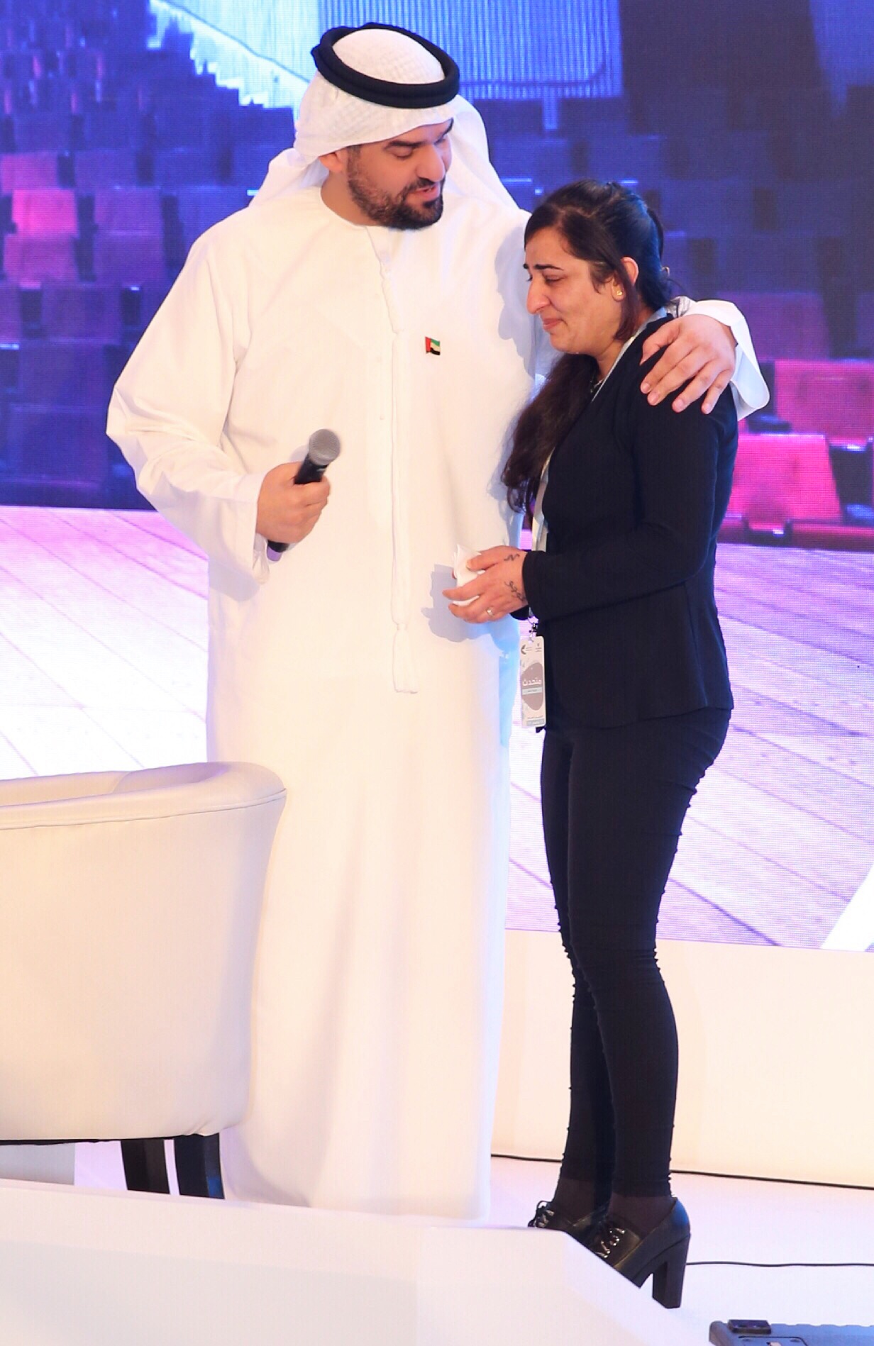 في مشهد مؤثر خلال حديثه، وعند الإستماع لمداخلات الحضور من الشباب، لبّى الجسمي طلب الشابة “فريدة عباس” التي كانت أسيرة لدى “داعش” لمدة